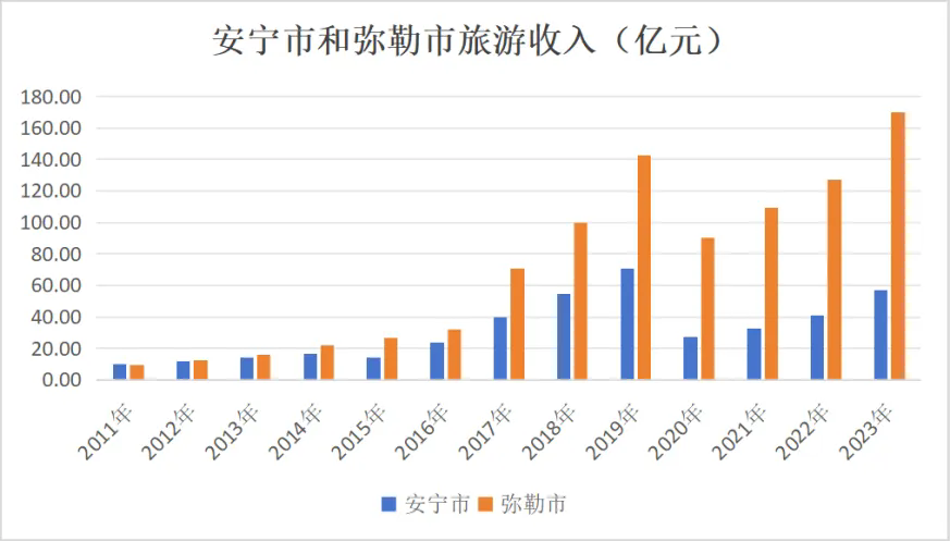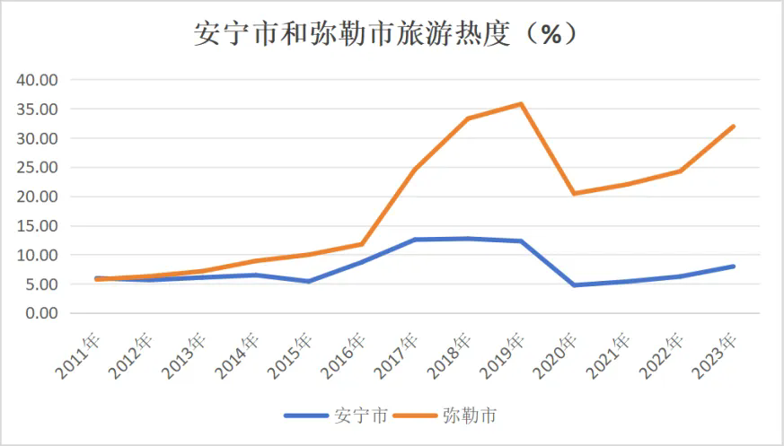 兩地在2013年之前的旅游熱度曾趨于一致,但隨后的發(fā)展軌跡卻大相徑庭,差距逐漸拉大,展示了彌勒市與安寧市在旅游產(chǎn)業(yè)發(fā)展上的巨大差異。