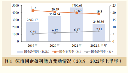 二是盈利能力穩(wěn)中有升(見圖1)。2019-2022年上半年,平均毛利率穩(wěn)定在20%左右;凈利率實(shí)現(xiàn)穩(wěn)步增長(zhǎng),平均凈利率分別為5.24%、6.12%、6.47%和7.11%,表明近年來深市國企在壓縮開支、控制成本等方面取得一定成效。