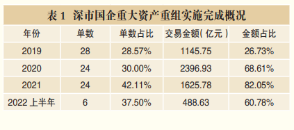 一是國企重組的規(guī)模明顯提升。從總體情況看,2019-2022年上半年深市國企共實(shí)施完成重大資產(chǎn)重組82單,交易金額合計(jì)5657.10億元。從歷年數(shù)據(jù)看(見表1),深市國企重組單數(shù)占比逐年攀升,自2019年的28.57%上升至2021年的42.11%;深市國企重組交易金額占比大幅提升,自2019年的26.73%攀升至2021年的82.05%。