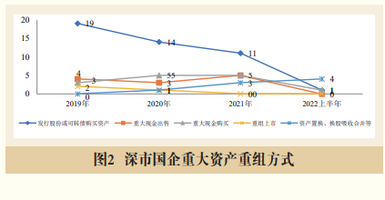 三是重組推動(dòng)產(chǎn)業(yè)整合,持續(xù)增強(qiáng)國企實(shí)力。發(fā)行股份購買資產(chǎn)仍為深市國企實(shí)現(xiàn)集團(tuán)優(yōu)質(zhì)資產(chǎn)整體上市的主要方式(見圖2)。2019-2022年上半年,近六成深市國企以發(fā)行股份購買資產(chǎn)的方式實(shí)現(xiàn)重大資產(chǎn)重組。一方面,部分國企集團(tuán)通過重組實(shí)現(xiàn)旗下產(chǎn)業(yè)板塊整體上市,提高集團(tuán)整體資本化率。例如,大冶特鋼(000708.SZ)發(fā)行股份購買國內(nèi)特鋼行業(yè)龍頭(興澄特鋼)86.5%的股權(quán),實(shí)現(xiàn)中信集團(tuán)特鋼板塊整體上市,并更名為中信特鋼,成為A股市場(chǎng)規(guī)模最大的專業(yè)化特鋼上市公司;天山股份(000877.SZ)整合中國建材(3323.HK)旗下水泥資產(chǎn)后,其資產(chǎn)和產(chǎn)能規(guī)模躍升至行業(yè)首位。另一方面,部分企業(yè)通過強(qiáng)強(qiáng)聯(lián)合提升核心競(jìng)爭(zhēng)力。例如,中化集團(tuán)與中國化工通過重組成為資產(chǎn)過萬億元、員工超20萬人的“產(chǎn)業(yè)巨輪”;鞍鋼集團(tuán)與本鋼集團(tuán)重組后,粗鋼產(chǎn)能達(dá)6300萬噸,營業(yè)收入達(dá)到3000億元,位居國內(nèi)第二、世界第三。