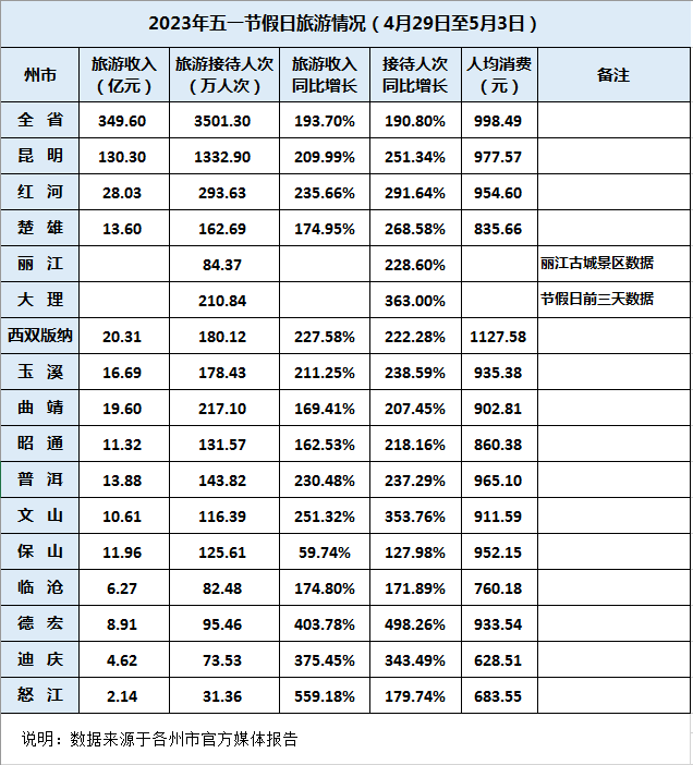 ? ? ? ? 云南省繼春節(jié)黃金周后再次展示旅游大省和旅游強省形象,2023年五一勞動節(jié)期間,共接待游客3501.3萬人次,實現(xiàn)旅游收入349.6億元,按可比口徑同比分別增長190.8%和193.7%,比2019年“五一”分別增長134.8%和130.4%。日均接待量突破700萬人次,是歷年來“五一”假日旅游市場最高。省外入滇游客達1698.8萬人次,占市場總量的48.5%,同比提高近20個百分點,其中貴州、重慶、四川等相鄰省份占省外旅游市場總量的41.4%,跨省游市場快速恢復。16個州市假日旅游市場同比均保持3位數(shù)的增長,游客量均較2022年同期翻了一番。