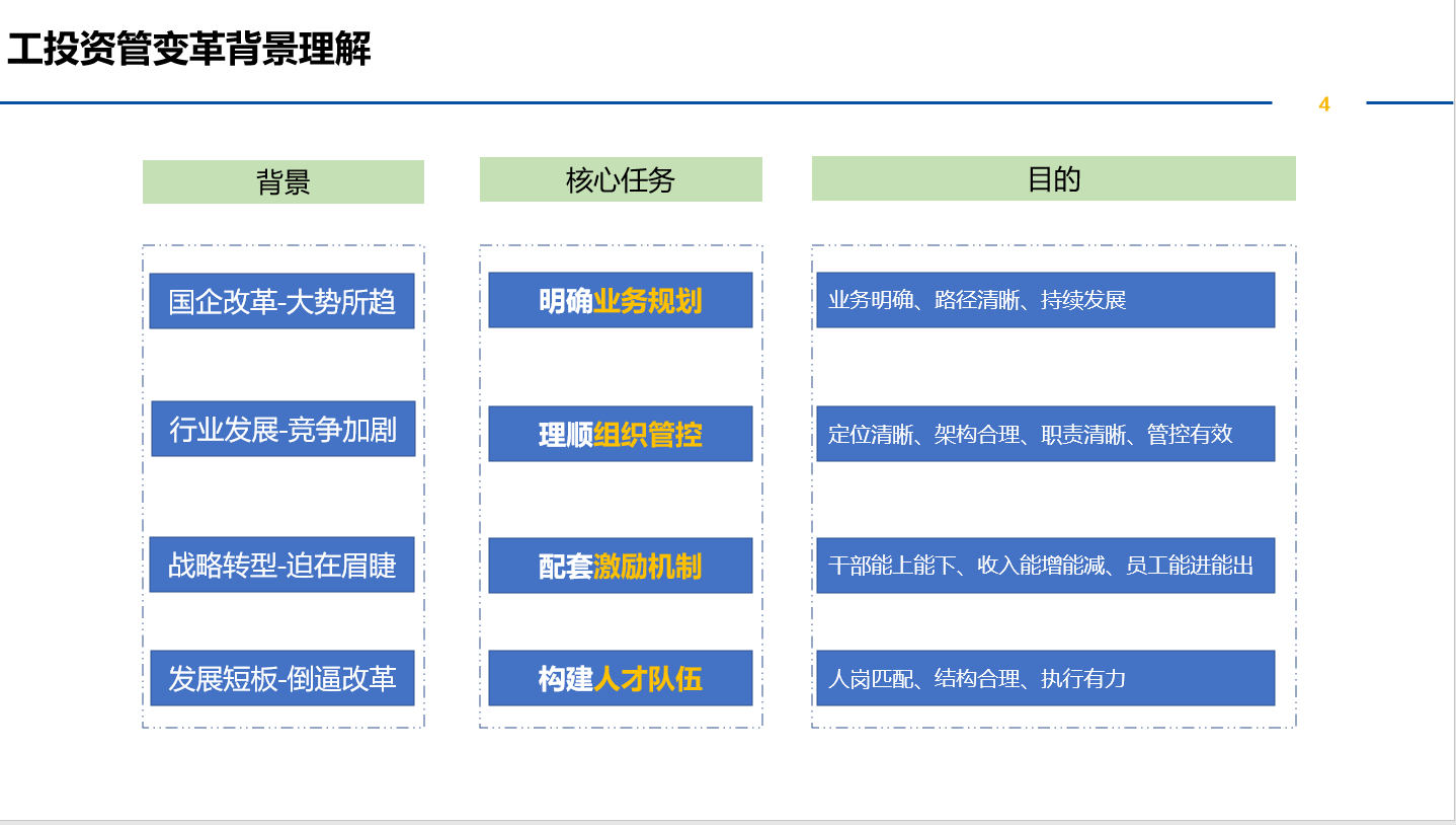 在新的經(jīng)濟發(fā)展形勢下,為搭建與工投資管業(yè)務發(fā)展和戰(zhàn)略目標相匹配的組織、薪酬、績效體系,工投資管對三項制度進行改革。在麥肯咨詢服務專業(yè)支持下,搭建專業(yè)的組織治理架構、完善市場化績效薪酬績體系。為企業(yè)發(fā)展的奠定堅實的基礎,為戰(zhàn)略目標的實現(xiàn)提供有力的保障。