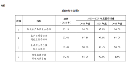 到2025年,新產(chǎn)品、新業(yè)態(tài)蓬勃發(fā)展,產(chǎn)品、工程、服務(wù)質(zhì)量水平顯著改善,制造業(yè)產(chǎn)品質(zhì)量合格率提高到96%,農(nóng)產(chǎn)品質(zhì)量安全例行監(jiān)測(cè)合格率達(dá)到98%以上,食品安全評(píng)價(jià)性抽檢合格率保持在98.5%以上,工程質(zhì)量抽查符合率不斷提高,城鎮(zhèn)新建建筑綠色建筑占比達(dá)到100%。