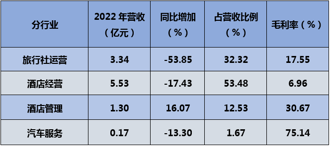 1、受疫情沖擊明顯,收入利潤下滑。疫情三年?duì)I收和凈利潤下滑幅度較大,2022年持續(xù)下滑,公司受疫情和政策沖擊較為明顯。公司最大的收入和利潤來源依托旅行社運(yùn)營業(yè)務(wù)(出入境、國內(nèi)),受疫情和政策影響,收入大幅下滑;公司第二大業(yè)務(wù)為酒店經(jīng)營和酒店管理,同樣面臨疫情沖擊,2022年酒店經(jīng)營收入貢獻(xiàn)最大,為53.48%,但毛利率僅有6.96%。后續(xù)出行市場信心逐步修復(fù)疊加積壓的出行需求釋放,有望帶動(dòng)公司商旅出行業(yè)務(wù)恢復(fù)。