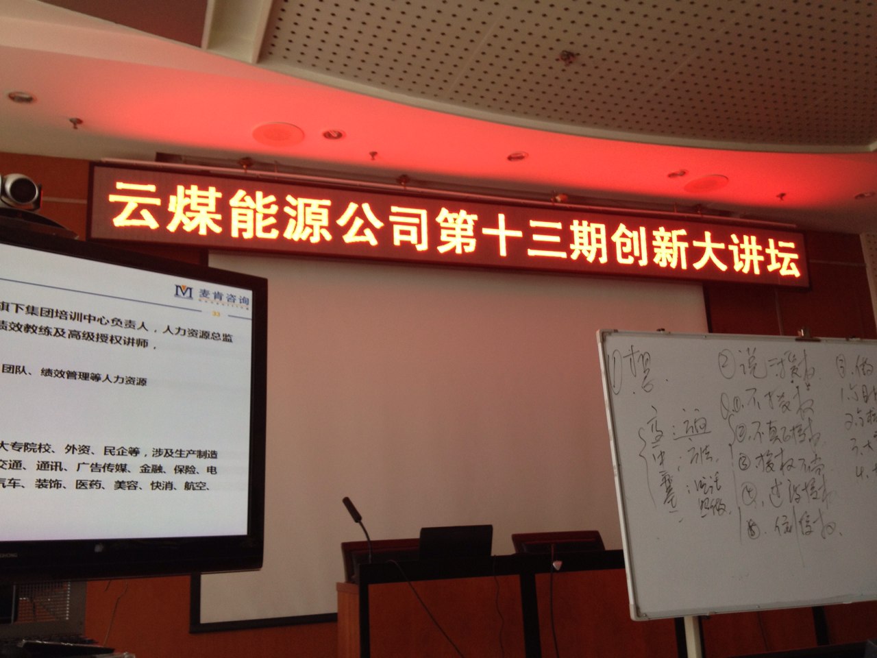 此次創(chuàng)新大講壇由麥肯咨詢總經(jīng)理朱章和高級培訓師趙笑美親自授課。從戰(zhàn)略績效理念、行為方法切入,闡述了一般企業(yè)績效管理誤區(qū),并深入分析了績效管理成功企業(yè)的案例,從不同側(cè)面將戰(zhàn)略績效話題以生動、清晰的形式進行了講述。云煤能源公司黨委書記李書記率領云煤能源中高層參與了“戰(zhàn)略績效”創(chuàng)新大講壇,并給予了高度評價,指出這次創(chuàng)新大講壇對于云煤能源目前時期具有戰(zhàn)略性的意義。