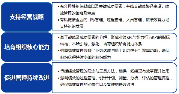 績(jī)效管理不僅僅為了考核或獎(jiǎng)金發(fā)放,而是需要支持經(jīng)營(yíng)戰(zhàn)略、培育組織核心能力、促進(jìn)管理持續(xù)改進(jìn)。